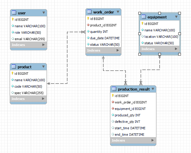 Product와WorkOrder는 1:N 관계Equipment가ProductionResult와WorkOrder를 각각 1:N 관계