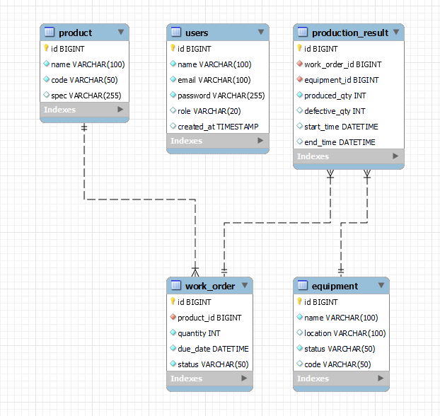 - 각 도메인(Product, Equipment, WorkOrder, ProductionResult)에 대해 RESTful API 설계 및 개발